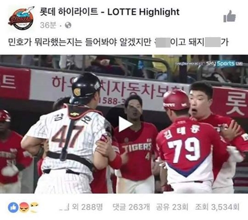 이 밖에도 롯데 팬이 운영하는 SNS 페이지에도 원색적인 비난 글이 올라와 논란의 불을 지폈다. 1만 2373명(16일 오전 기준)이 팔로우하고 있는 이 페이지에는 '민호가 뭐라 했는지는 들어봐야 알겠지만 XX이고 돼지 XX가'라는 글과 함께 벤치 클리어링 영상이 링크됐다.