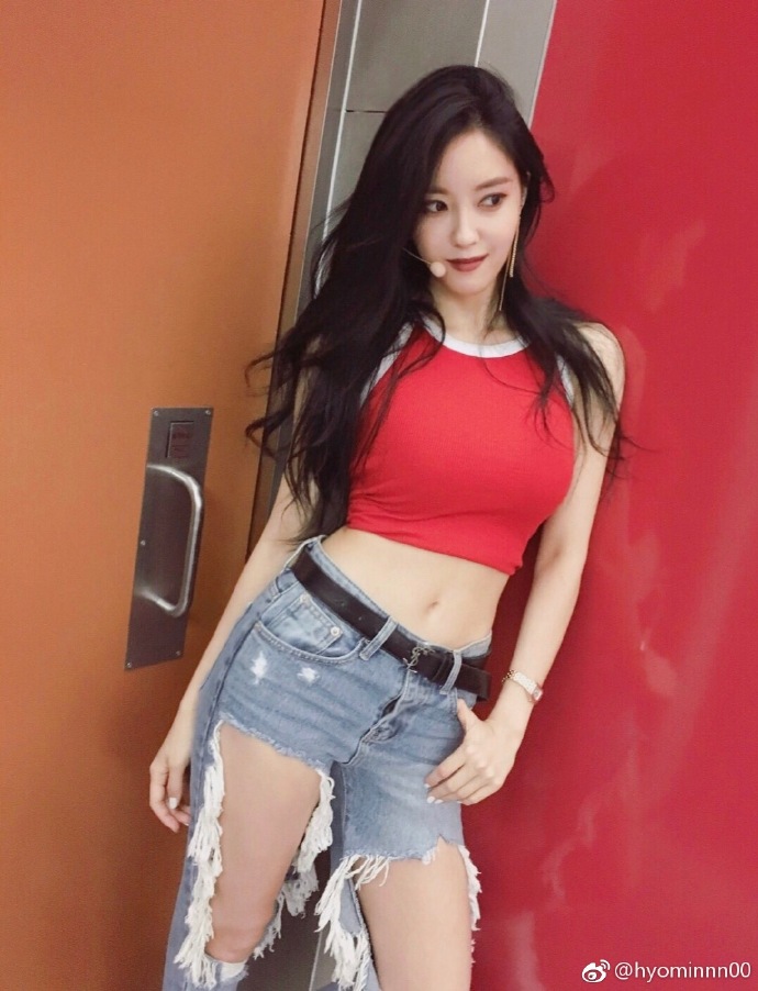 사진 속 효민은 레드 컬러의 크롭톱과 찢어진 진을 입고 펑키하면서 섹시한 룩을 선보였다. 의상 사이로 탄탄한 복근과 매끈한 각선미를 뽐내 감탄을 자아낸다.