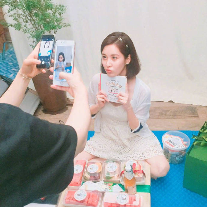 공개된 사진에는 짧은 단발머리로 변신한 서현이 여러 가지 선물을 들고 셀피를 선보이고 있다. 화이트 컬러의 원피스를 입고 깨끗하면서도 청순한 매력을 드러냈다.