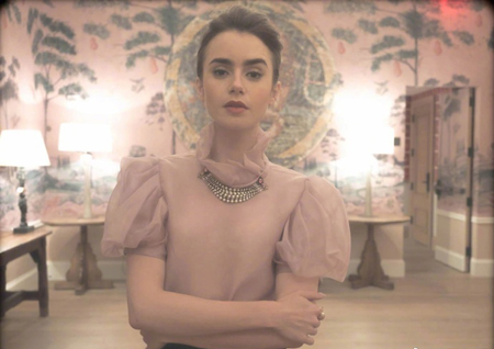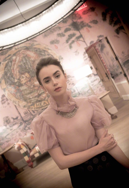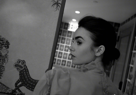 화보에서 릴리 콜린스는 복고풍의 배경에서 우아한 분위기를 드러냈다. 시폰 소재의 블라우스와 블랙 컬러의 스커트를 입고 여성스러운 매력을 뽐냈다.