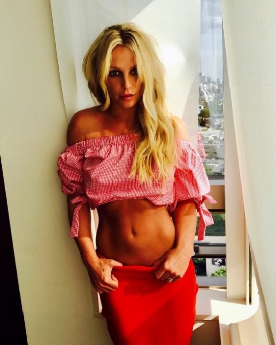 사진 속 브리트니는 핑크 스트라이프 패턴이 들어간 오프숄더 블라우스와 레드 컬러의 스커트를 입고 섹시한 매력을 과시했다. 의상 사이로 탄탄한 복근을 드러내 남심을 저격했다.