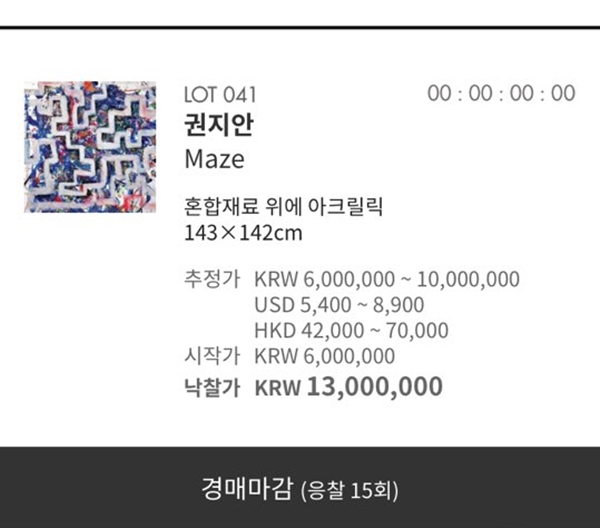 국내 최대 미술품 경매회사 서울옥션 온라인 경매 서울옥션블루에 나온 솔비의 작품 '메이즈'(Maze)'가 무려 15번의 응찰 끝에 1300만원에 최종 낙찰된 것. 최초 시작가는 600만원이었다.'메이즈'의 최초 추정하는 600~1000만원인 걸 감안하면 낙찰가(1300만원)는 이를 훌쩍 뛰어넘는 가격이다.