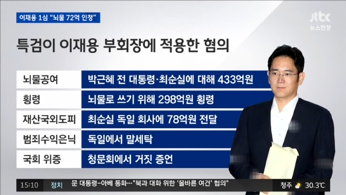 재판부는 박 전 대통령과 최 씨 측에 433억 원 상당의 뇌물을 제공하거나 주기로 약속한 혐의 등으로 기소된 이 부회장에 대해 징역 5년을 선고했다.