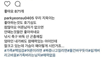 여기에 덧붙여 '어른이라면, 가족, 책임감, 짜증 나고 질리면 물건 바꾸듯이 쉽게 버리고 바꿈, 가족 버리는 남자 매력 없음'이라는 해시태그를 달아 눈길을 끌었다.