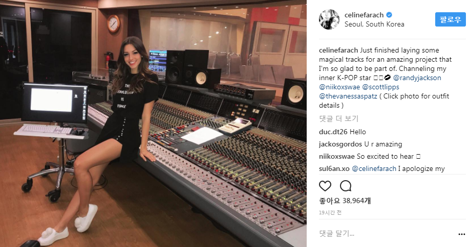 사진 속 그는 녹음실에서 아름다운 각선미를 뽐내고 있다. 이외에도 한국 식당을 방문한 모습과 한국에서 만난 사람들에게 한국어를 배우는 모습 등이 담긴 동영상을 게재했다.