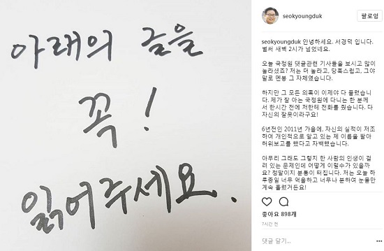 이에 서 교수는 4일 자신의 인스타그램에 억울함을 호소하는 글을 게시했다. 그는 당혹감을 감추지 못하면서 "잘 아는 국정원에 다니는 한 분께서 한 시간 전에 저한테 전화를 줬다. 6년 전인 2011년 가을에, 자신의 실적이 저조해 개인적으로 알고 있는 내 이름을 팔아 허위보고를 했다고 자백했다"고 전했다.