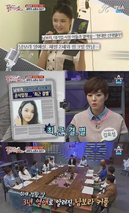 채널 A 예능 프로그램 '풍문으로 들었쇼'에서 한 기자가 "한 매체에서 남보라가 어떤 남성과 함께 쇼핑몰에서 손을 잡고 걷는 사진을 공개하며 열애설을 보도했다"라며 "알고보니 그 상대가 이름만 들어도 누구나 다 아는 대기업의 자제였다"라고 말했다.