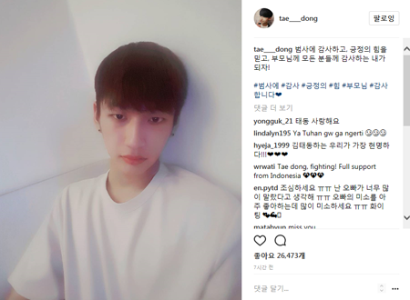 김태동은 18일 자신의 인스타그램에 "범사에 감사하고, 긍정의 힘을 믿고, 부모님께 모든 분들께 감사하는 내가 되자!"라는 내용의 글과 함께 한 장의 사진을 올렸다.