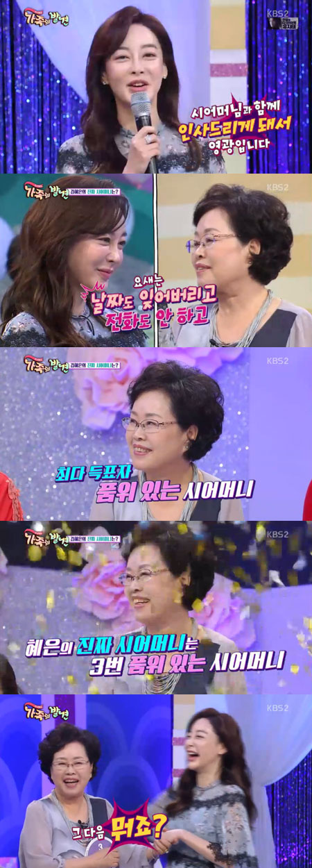 다음으로는 김혜은이 시어머니 후보들과 함께 등장했다. 돌직구 시어머니부터 음악의 신, 품위 있는 시어머니, 패션왕, 고고한 시어머니까지 총 5명의 후보가 나와 진짜 시어머니 같은 열연을 펼쳤다.