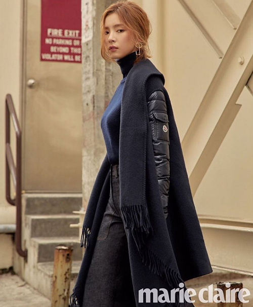두번째 사진은 가을 보다는 겨울의 분위기에 가깝다. 두터운 점퍼와 파란색 니트로 매치했고 마무리로 검은색 목도리를 걸쳤다. 두터운 옷 속에서도 섹시미가 드러나 눈길을 끈다.