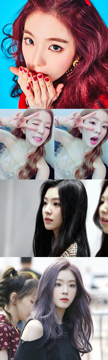 사진 속 아이린은 흑발, 핑크색 투톤, 보라색, 갈색, 빨간색 등 형형색색으로 염색한 모습이다. 그 어떤 색으로 염색해도 완벽한 꽃미모를 뽐냈다.