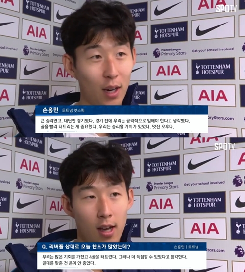 [스포츠서울 김도형기자] '손세이셔널' 손흥민(25·토트넘 핫스퍼)이 리버풀을 상대로 올 시즌 리그 첫 골을 기록한 가운데 깔끔한 영어 인터뷰 솜씨를 뽐내 눈길을 끌고 있다.