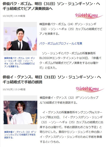 일본 최대 포털 사이트인 '야후 재팬'은 송중기, 송혜교의 결혼 소식과 더불어 박보검이 피아노 연주를, 이광수가 편지를 낭독하는 이벤트를 한다는 내용을 주요 소식으로 다뤘다.