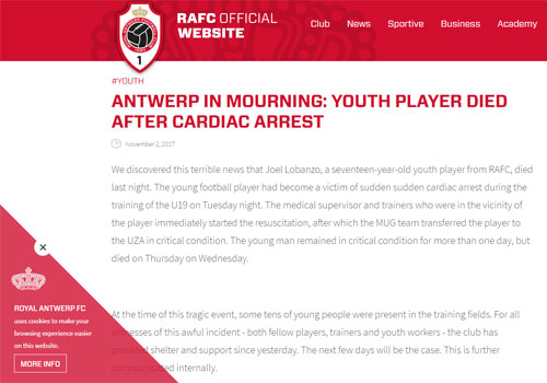 [스포츠서울] 훈련 중 심장마비로 쓰러진 벨기에 축구 클럽 로얄 앤트워프 FC 소속 축구 선수 조엘 로반조(17)가 결국 사망했다.