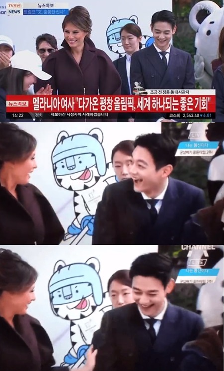 [스포츠서울 권준영기자] 도널드 트럼프 미국 대통령의 영부인 멜라니아 트럼프가 그룹 샤이니 민호를 보고 환하게 웃으며 가벼운 스킨십을 하는 포습이 포착돼 화제를 모으고 있다.