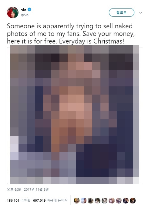 시아는 지난 6일 자신의 트위터에 "누군가 나의 나체 사진을 팬들에게 팔고 있다"며 "돈 쓸 필요 없다. 이건 공짜다. 매일이 크리스마스다!"라며 옷을 벗고 있는 자신의 뒷모습이 찍힌 사진을 게시했다.