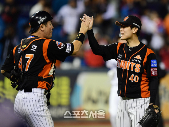 2017 준플레이오프 4차전. 승리를 확정지은 후 박진형과 하이파이브를 나누고 있다.