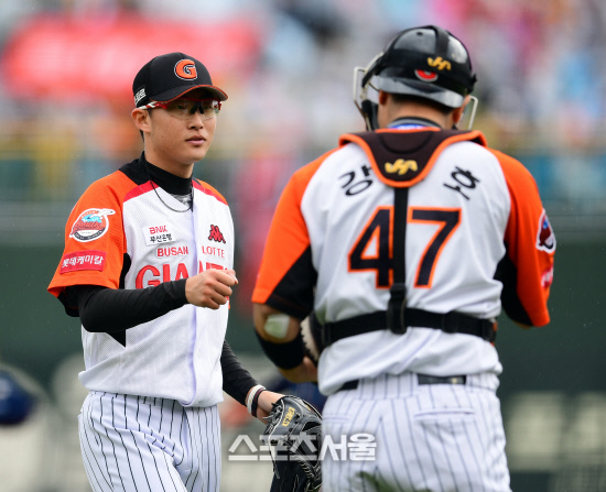 2017 준플레이오프 5차전. 강민호가 1회 무실점으로 막은 박세웅과 주먹을 맞대고 있다.
