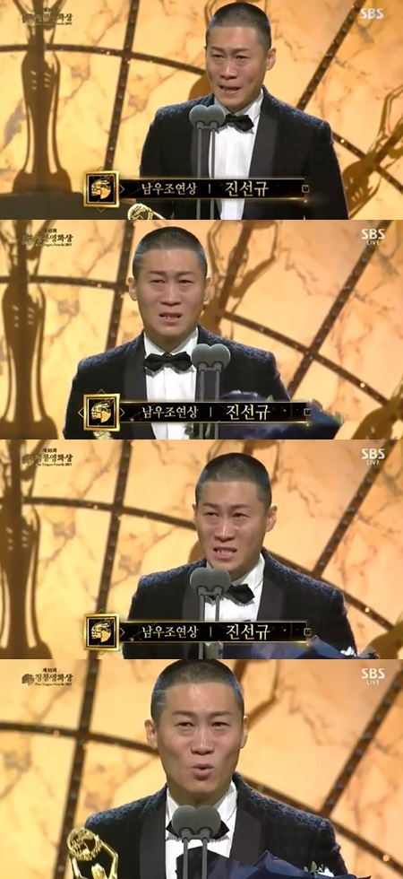 눈물을 흘리며 무대에 오른 진선규는 한동안 말을 잇지 못했다. 눈물을 쏟아내는 그를 보며 관객석에서 누군가 "잘생겼다"고 외치자 "저 잘생긴 건 아니고요. 저 중국에서 온 조선족 아니고 대한민국 국민"이라며 "이 자리에 오는 것만으로 너무 떨려서 청심원을 먹고 왔는데 상을 받을 줄 알았으면 하나 더 먹었어야 했나 보다"라고 너스레를 떨어 웃음을 안겼다.