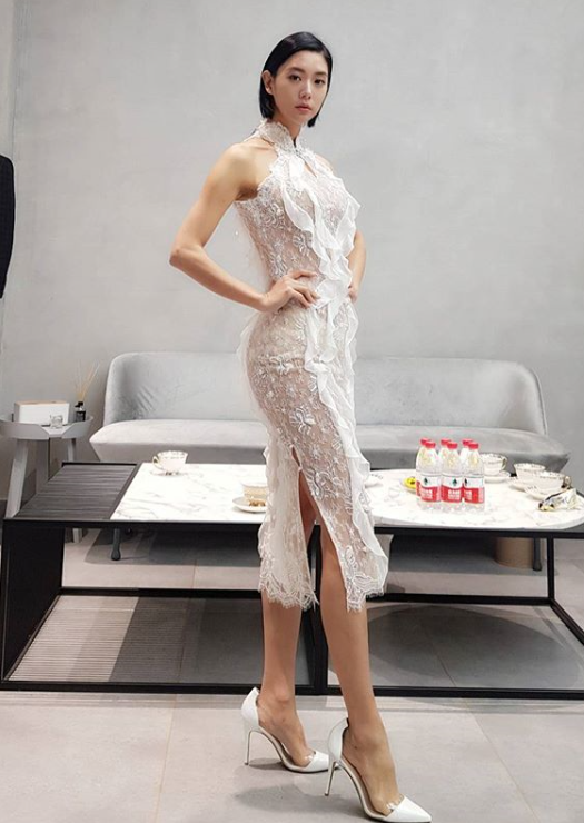 공개된 사진 속 클라라는 파격적인 전신 시스루 디자인의 화이트 드레스를 입고 포즈를 취하고 있다.