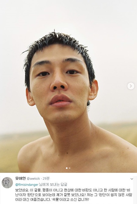 유아인은 27일 오전 자신의 트위터에 "보았네요. 이 글을. 평론이 아니고 현상에 대한 비판도 아니고 한 사람에 대한 '비난'이자 '판단'으로 보이는데 제가 잘못 보았나요? 저는 그 '판단'이 쉽지 않은 사람이라 대신 여쭙겠습니다. '속물'이라고 쓰신 겁니까?"라는 글을 올렸다.