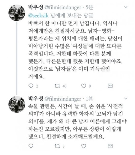 이어 박우성은 "바빠서 한 마디만 먼저 남깁니다. 역시나 저에게만은 친절하시군요. 남자-영화-평론가라는 제 위치에 대한 배려는, 당신이 비아냥거린 수많은 '여성들'에 대한 또 다른 폭력"이라며 "저한테 하듯이 다른 분께 했든가, 다른 분한테 했듯 저한테 했어야죠. 이것만으로 '남자들'은 이미 기득권인 것"이라고 답했다.