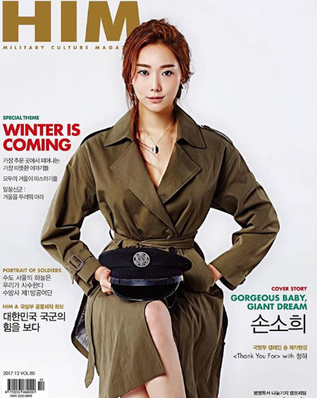손소희는 27일 오후 자신의 인스타그램에 "국군 장병 여러분. 파이팅입니다! Him-magazine"이라는 내용의 글과 함께 해당 화보의 표지 사진을 게재했다.