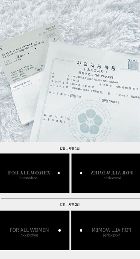한서희는 5일 오후 자신의 인스타그램에 "이제 통신판매업 신고만 하면 끝. 홈페이지도 개설될 예정입니다. 그나저나 상호명 어떡하냐고ㅠ 에이치엑스엑스 구구절절"이라는 내용의 글과 함께 사업자등록증 사진을 올렸다. 또한 옷에 달릴 택 사진을 공개하며 쇼핑몰 오픈을 예고했다.