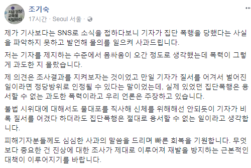 15일 오후 조 교수는 자신의 페이스북에 "SNS로 소식을 접하다 보니 기자가 집단 폭행당했다는 사실을 파악하지 못하고 발언했다"라며 사과의 뜻이 담긴 글을 게재했다.
