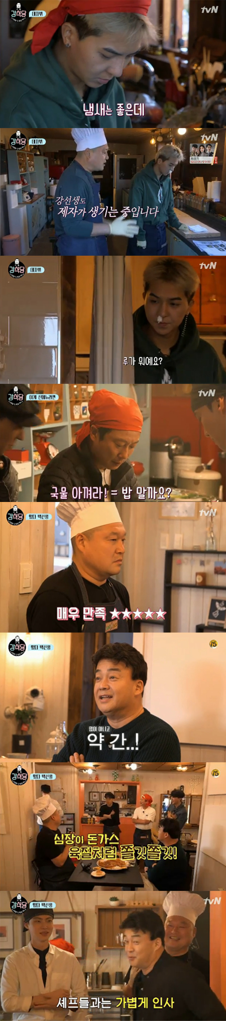 음식을 맛본 백종원은 멤버들을 불러놓고 평가에 나섰다. 강호동과 나머지 멤버들은 바짝 긴장했고, 음식을 다 맛본 백종원은 "이 사인 다시 안 가져가도 될 거 같다"라며 "너무 만족스럽다"라고 칭찬했다.