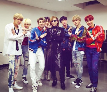 공개된 사진 속에서 요시키와 방탄소년단은 엑스 재팬을 의미하는 'X'자 팔 모양을 해 훈훈한 분위기를 자아냈다.