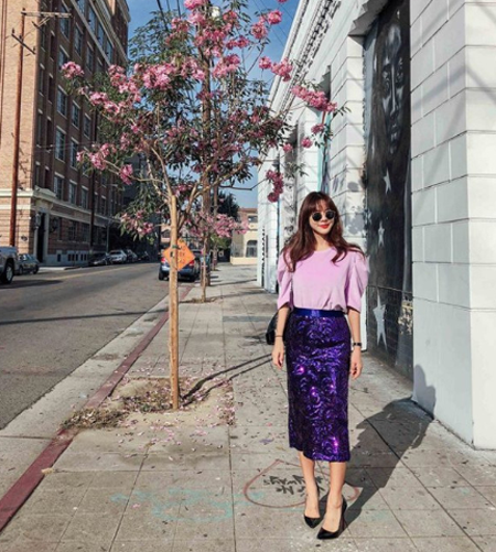 공개된 사진에는 러블리한 핑크색 티와 반짝이는 보라색 치마를 입고 엘레강스한 매력을 뽐내는 김준희의 모습이 담겼다.