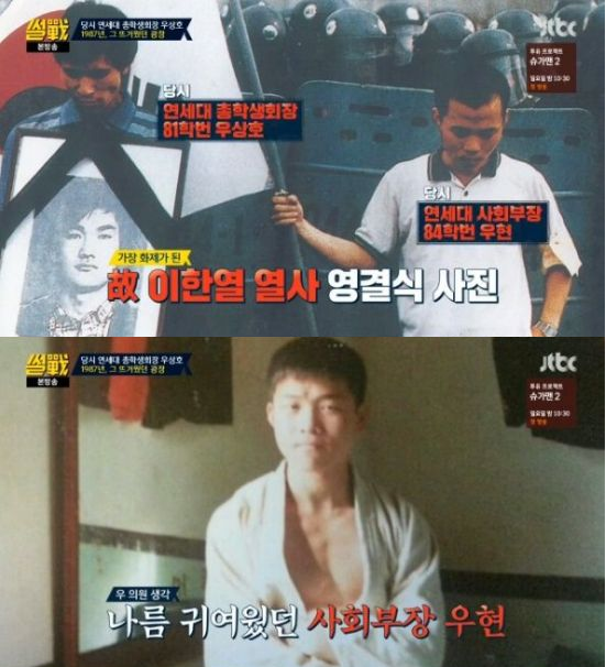 이날 스튜디오에는 최근 온라인에서 화제가 되고 있는 1987년 6월 민주항쟁 현장 사진이 등장했다. 故 이한열 열사의 영정 사진을 들고 있는 우 의원과 옆에서 태극기를 들고 있는 우현의 모습이 담긴 사진이었다.