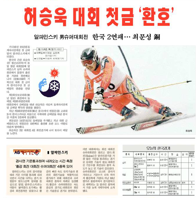 제2회삿포로대회(90년 일본) 회전에서 동메달, 제3회 하얼빈대회 대회전에서 은메달을 따낸 허승욱은 이로써 동계아시안게임 금메달 획득의 염원을 풀었다.