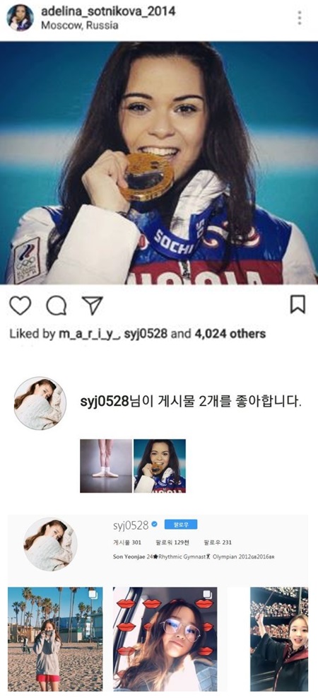 [스포츠서울 권준영기자] 리듬체조 국가대표 출신 방송인 손연재가 러시아 여자 피겨 선수 아델리나 소트니코바(21)의 금메달 사진에 '좋아요'를 눌렀다가 끝내 SNS 계정을 비공개로 전환했다.