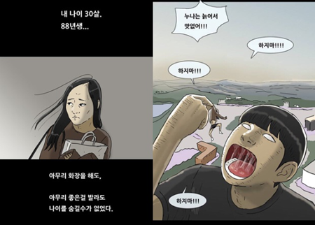 해당 웹툰에서 나이보다 노안으로 보이는 얼굴을 가진 노안숙은 "아무리 화장을 해도, 아무리 좋은 걸 발라도, 나이를 숨길 수가 없었다"며 "결국 나이는 이기지 못했다. 보세로 꾸민 20살이 훨씬 예쁘다"며 자신을 자책한다.