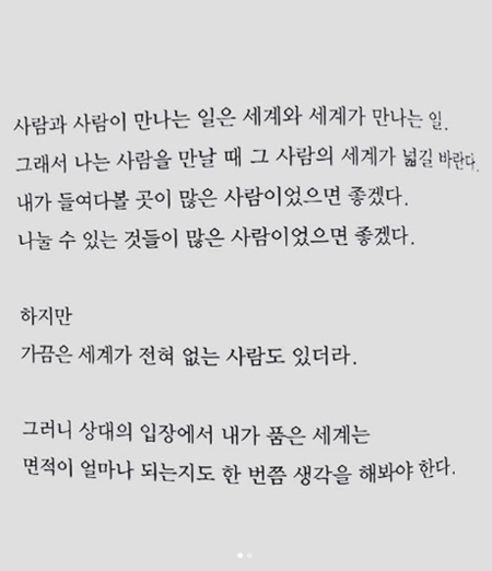 또 "하지만 가끔은 세계가 전혀 없는 사람도 있더라. 그러니 상대의 입장에서 내가 품은 세계는 면적이 얼마나 되는지도 한 번쯤 생각을 해봐야 한다"라는 내용이 담겼다.