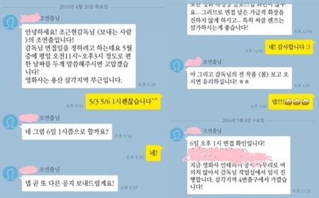 해당 여성은 "저는 연기과에 재학 중인 여대생입니다"라는 글과 함께 과거 조근현 감독이 연출했던 영화 '보내는 사람' 오디션을 봤을 당시 조연출과 나눈 모바일 메신저 화면을 캡처해 게재했다.