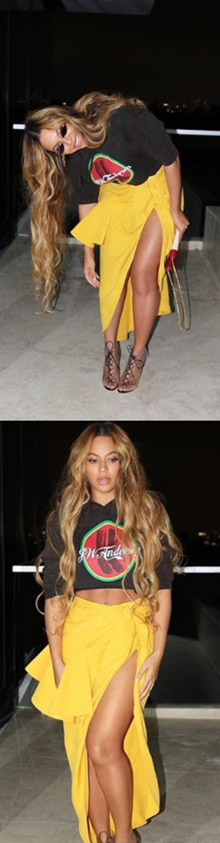 사진 속 비욘세는 모자, 선글라스, 후드 티로 조화시킨 스타일링으로 패셔니스타다운 면모를 뽐냈다. 특히 노란빛 절개 롱 스커트로 탄탄한 각선미를 과시해 눈길을 사로잡았다. 일어서있는 모습에서는 콜라병 몸매도 돋보인다.