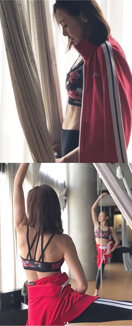 사진 속 야노시호는 레깅스와 브라톱을 입고 고난도 플라잉 요가를 선보이고 있다. 다리를 곧게 피고 몸을 활처럼 휘어 완벽한 라인을 뽐냈다.