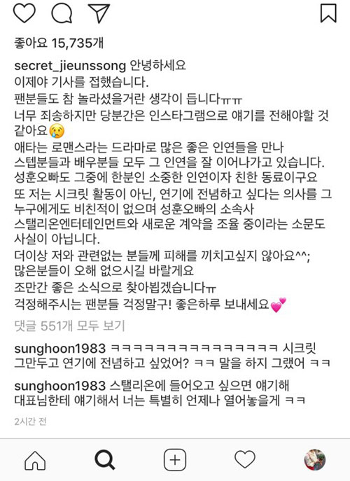 이어 "저는 시크릿 활동이 아닌, 연기에 전념하고 싶다는 의사를 그 누구에게도 비친 적이 없으며 성훈 오빠의 소속사 스탤리온엔터테인먼트와 새로운 계약을 조율 중이라는 소문도 사실이 아니다"라고 덧붙였다.