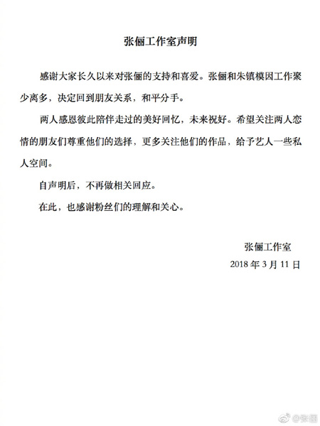 장리의 소속사 장리 공작실 측은 11일 오후 웨이보를 통해 성명서를 발표했다.