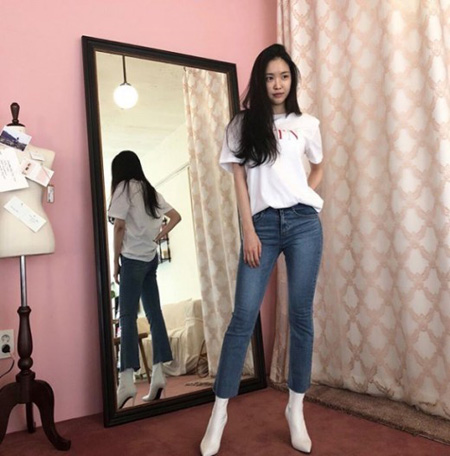 공개된 사진 속 손나은은 소화하기 힘든 청바지에 흰 티 패션을 선보이고 있다. 몸에 딱 달라붙는 스키니진으로 각선미를 강조, 긴 다리를 뽐내 눈길을 끌었다.
