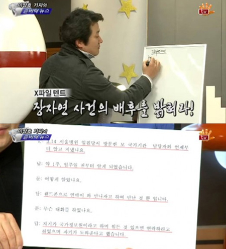 이날 방송에서 이 기자는 "장자연이 자살한 2009년 3월 7일, 유씨가 국정원 직원과 만난 사실이 포착됐다"라며 "이에 대해 국정원이 해명해야 한다"고 목소리를 높였다.