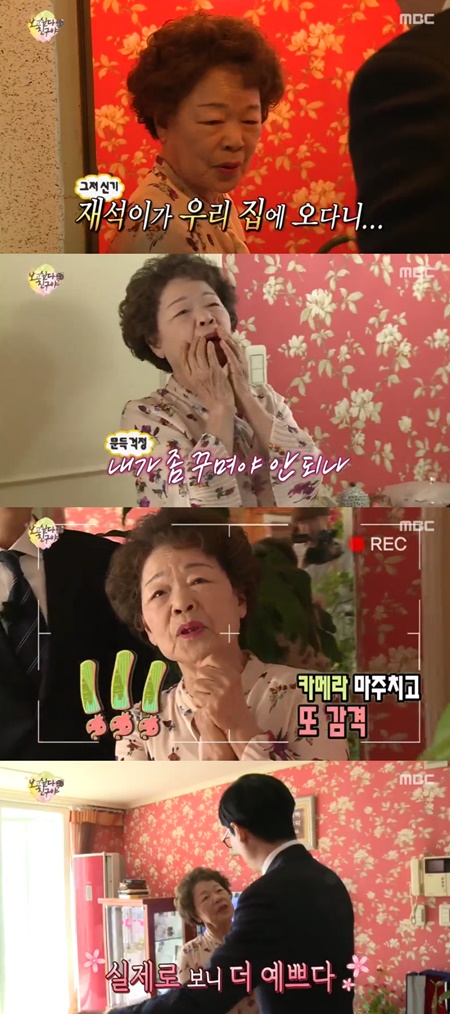 김제동 어머니 박동연 씨는 급히 꽃단장을 하고 나와 유재석에게서 한시도 시선을 떼지 못하며 "우예 이렇게 곱노"라며 폭풍 칭찬을 아끼지 않았다. 또 함박 미소를 지으며 꿀 떨어지는 특급 애정을 보여줬다.