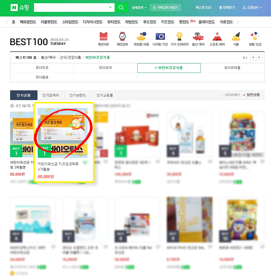 [스포츠서울 김수지기자] 프리미엄 건강기능식품 전문 브랜드 더플로레의 성장기 어린이 영양제 ‘키즈징크락토’가 네이버 쇼핑 어린이건강식품부문 베스트100에서 1위 자리를 차지했다.