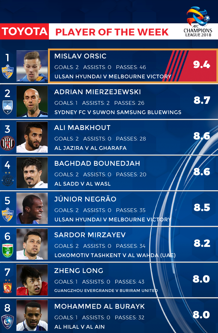 5일 AFC는 조별 예선 5라운드가 끝난 2018 ACL 이주의 선수에 울산의 크로아티아 출신 윙어 오르샤가 선정됐다고 발표했다. 오르샤는 지난 4일 울산문수경기장에서 열린 대회 F조 5라운드 멜버른 빅토리와 경기에 출전해 2골을 몰아치며 6-2 대승을 견인했다. 울산은 이날 승리로 16강 진출을 조기 확정했다.