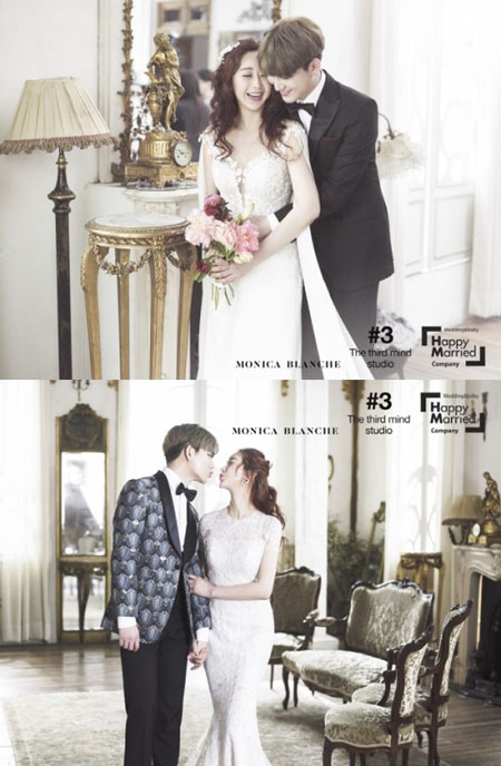 공개된 사진 속 두 사람은 각각 웨딩드레스와 턱시도를 차려입고 다정한 분위기를 자아냈다. 미소를 짓는가 하면 입을 맞추려는 포즈 등을 통해 달달한 예비부부의 모습이 담겨 눈길을 끌었다.