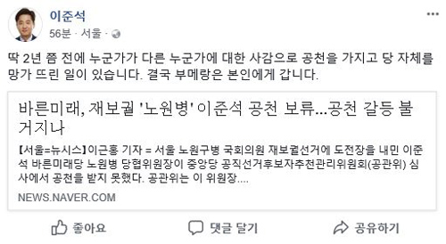 이에 이 위원장은 자신의 SNS에 "딱 2년쯤 전에 누군가가 다른 누군가에 대한 사감으로 공천을 가지고 당 자체를 망가 뜨린 일이 있다. 결국 부메랑은 본인에게 간다"는 의미심장한 글을 남겼다.