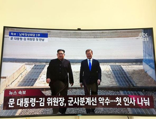 오늘(27일) 오전 9시 29분 판문점 군사분계선에서 문 대통령과 북한 김 국무 위원장이 처음으로 만났다. 남한과 북한 정상 만남은 11년 만이며, 남측의 '평화의 집'에서 남북정상회담이 개최된다.